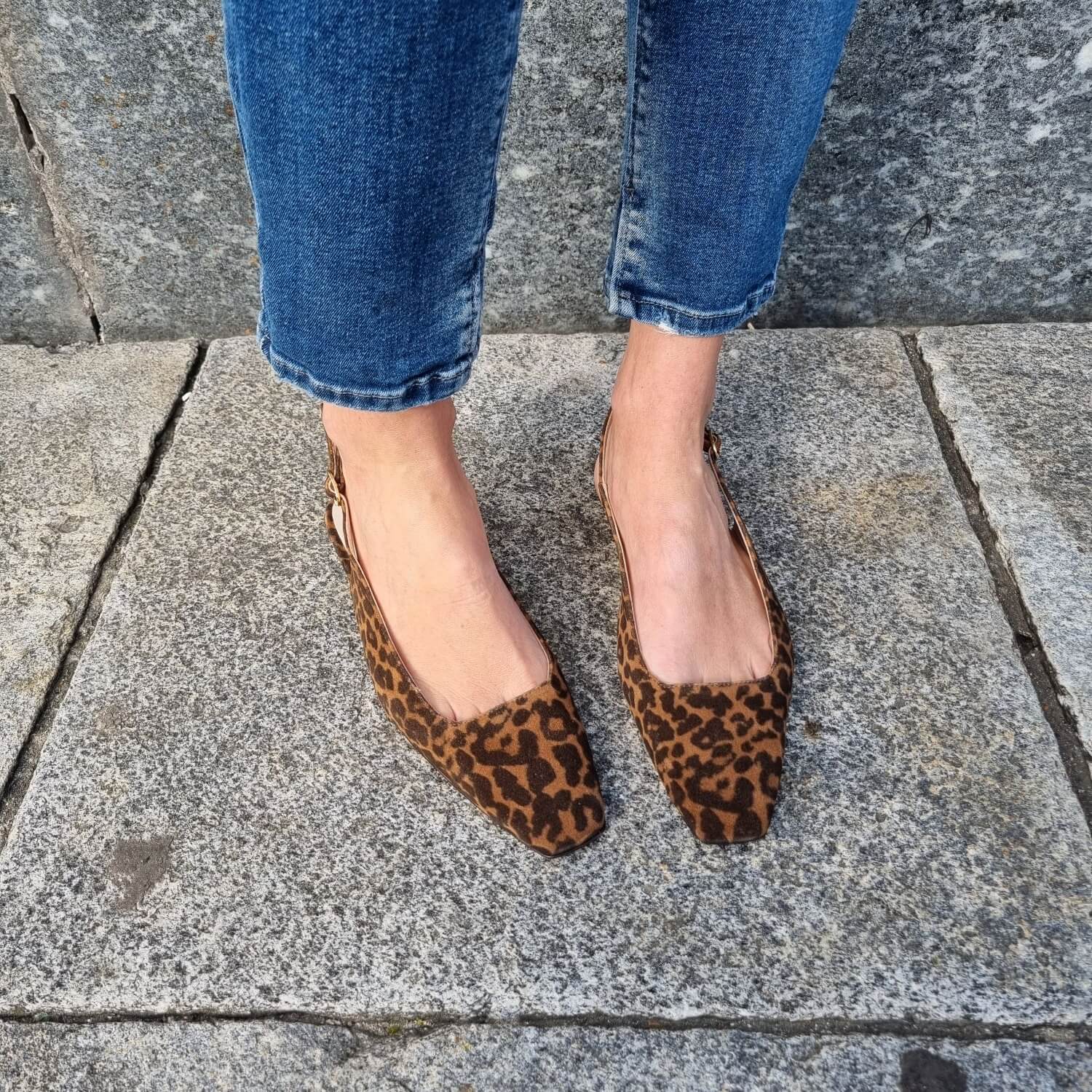 The Mia Moltrasio slingback sandal in animalier leather has a square toe and neckline.