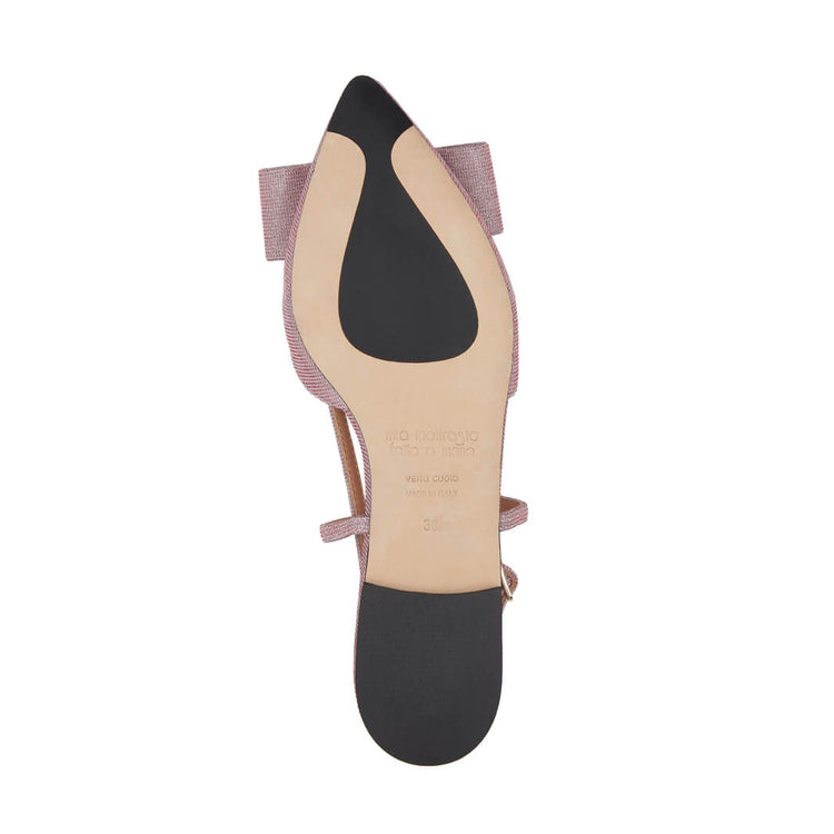 Handcrafted in Italy, Mia Moltrasio slingback sandals are made of gold glittering fabric with a matching bow. The lace is lit up by the same fabric.