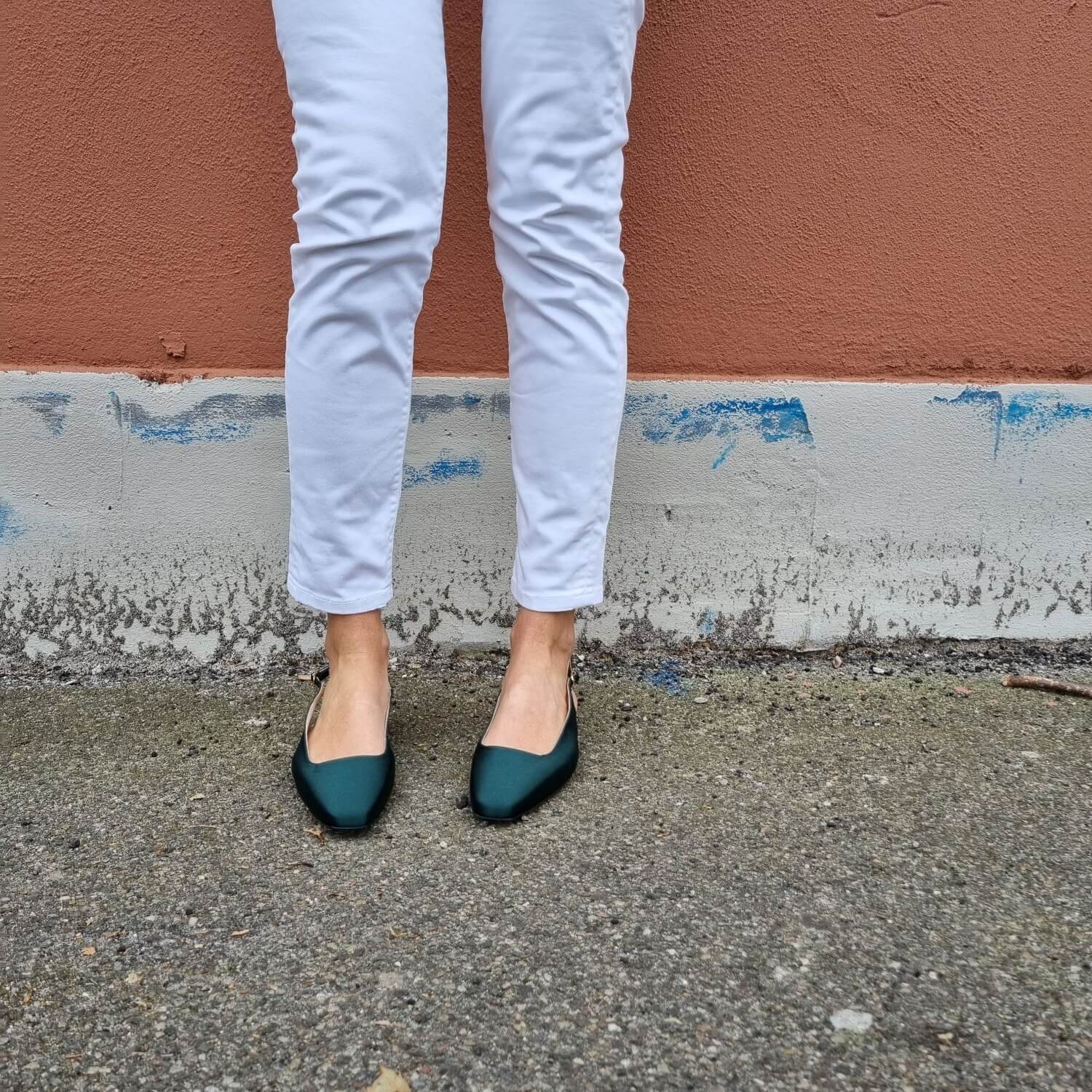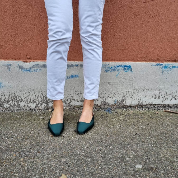 The Mia Moltrasio slingback sandal in green satin has a square toe and neckline.